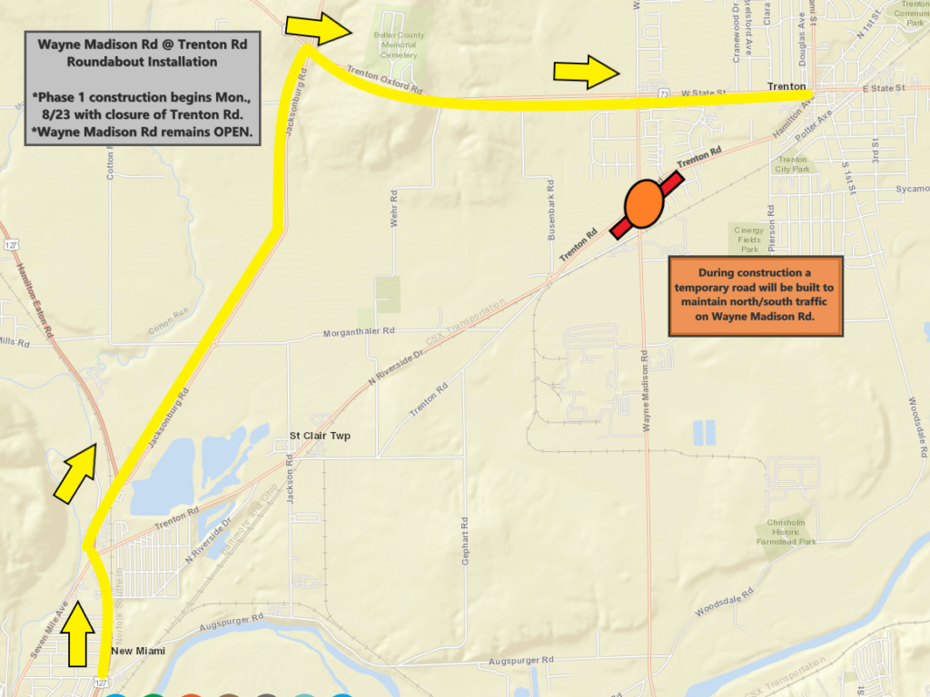 The Butler County Engineer’s Office reports that Trenton Road will close approximately one-quarter of a mile west and east of Wayne Madison Road for the first phase of construction of the Wayne Madison Road at Trenton Road roundabout beginning Monday, August 23, 2021. While local access will be maintained for residents, businesses, and emergency vehicles up to the project limits during the closure, motorists will not be permitted to pass through the actual construction zone. Trenton Road will remain closed until the completion of the project; however, Wayne Madison Road’s north/south traffic will be maintained. The project is tentatively scheduled to be completed in November 2021.