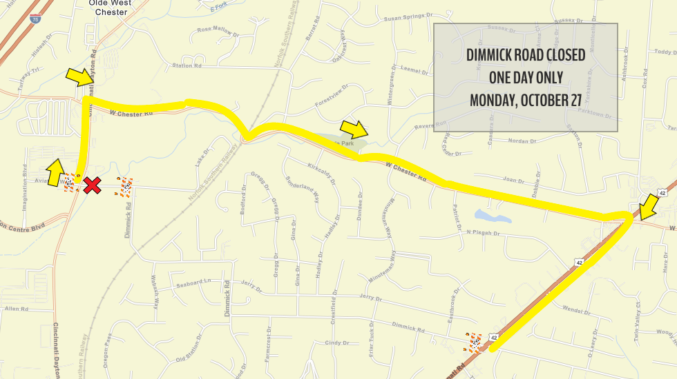 Detour: Eastbound Dimmick Road traffic will detour north on Cincinnati Dayton Road, east on West Chester Road, and south on U.S. 42. Westbound traffic will reverse this route.