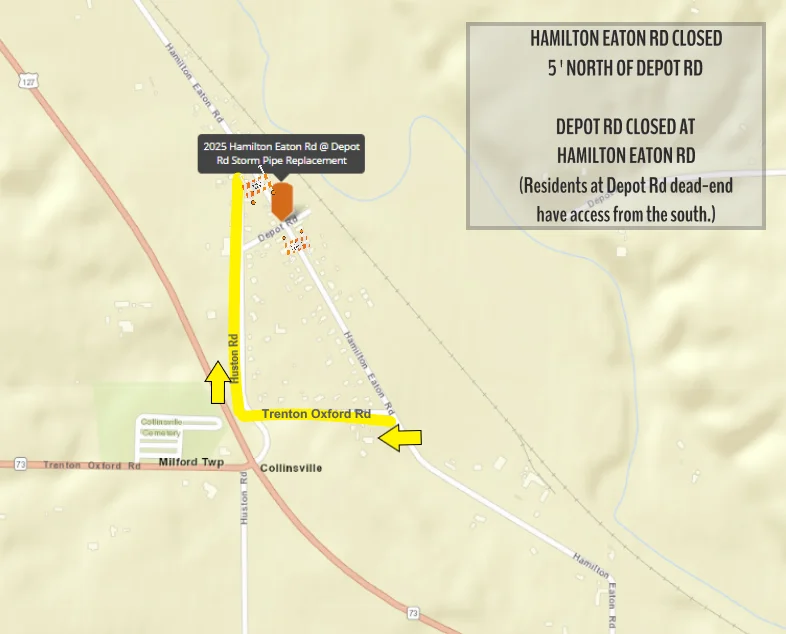 Detour: Northbound Hamilton Eaton Road traffic will detour west on Trenton Oxford Road and north on Huston Road. Southbound traffic will reverse this route.