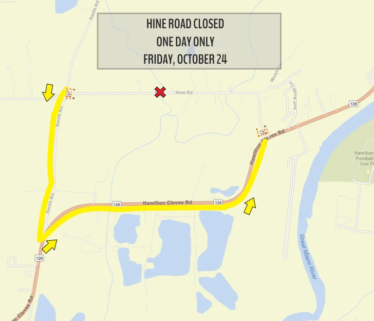 Detour: Eastbound Hine Road traffic will detour south on Smith Road and northeast on S.R. 128. Westbound traffic will reverse this route.
