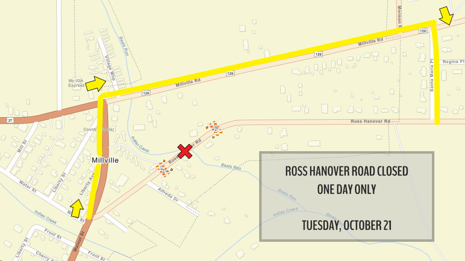 Ross Hanover Road Detour: Eastbound Ross Hanover Road traffic will detour north on U.S. 27, east on S.R. 129, and south on Santa Maria Place. Westbound traffic will reverse this route.