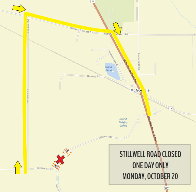 Stillwell Road Detour: Eastbound Stillwell Road traffic will detour north on Decamp Road, east on Stillwell Beckett Road, and south on U.S. 27. Westbound traffic will reverse this route.