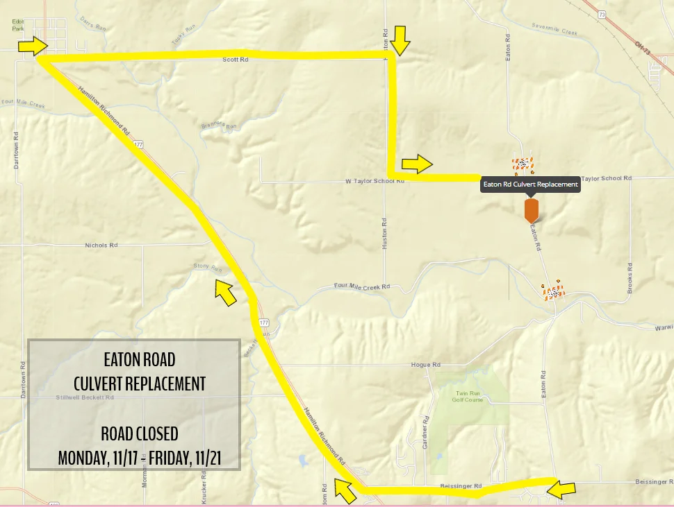 The Butler County Engineer’s Office reports that Eaton Road will close 0.6 miles north of Brooks Road and 0.3 miles south of Taylor School Road for a culvert replacement beginning Monday, November 17, 2025. The road will be closed to all through traffic and is tentatively scheduled to reopen on November 21, 2025.