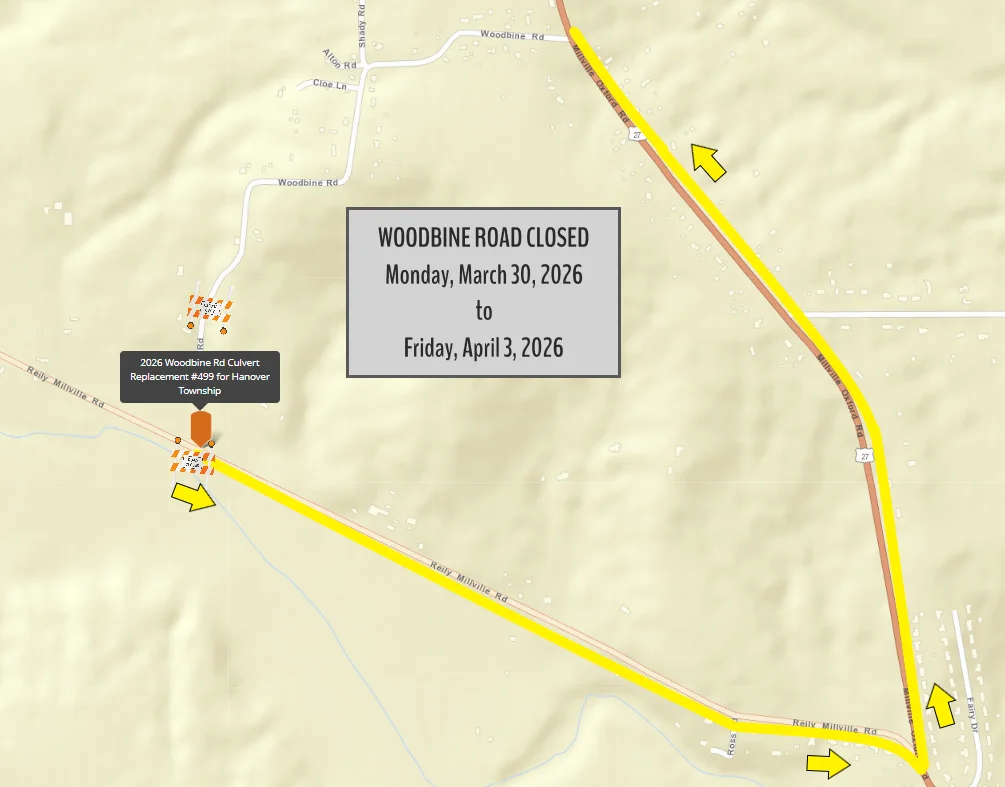 The Butler County Engineer’s Office reports that Woodbine Road will close five feet north of Reily Millville Road and one mile west of U.S. 27 for a culvert replacement beginning Monday, March 30, 2026. The BCEO will perform the culvert work for Hanover Township, which requires closing the road to all through traffic until April 3, 2026, weather permitting.