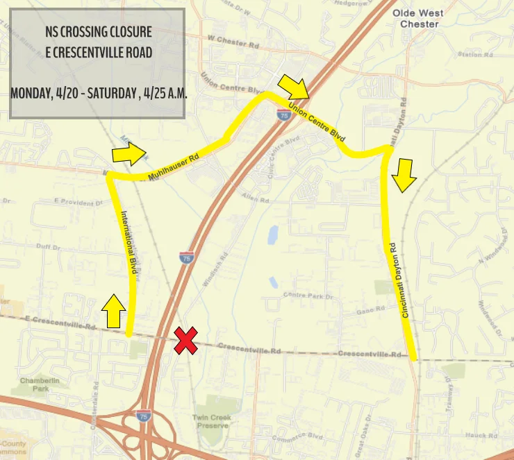The Butler County Engineer’s Office reports that Norfolk Southern Railway (NS) will close East Crescentville Road at the crossing between Champion Way and Windisch Road for a rail defect repair beginning Monday, April 20, 2026. The road will be closed to all through traffic and is tentatively scheduled to reopen on Saturday morning, April 25, 2026.